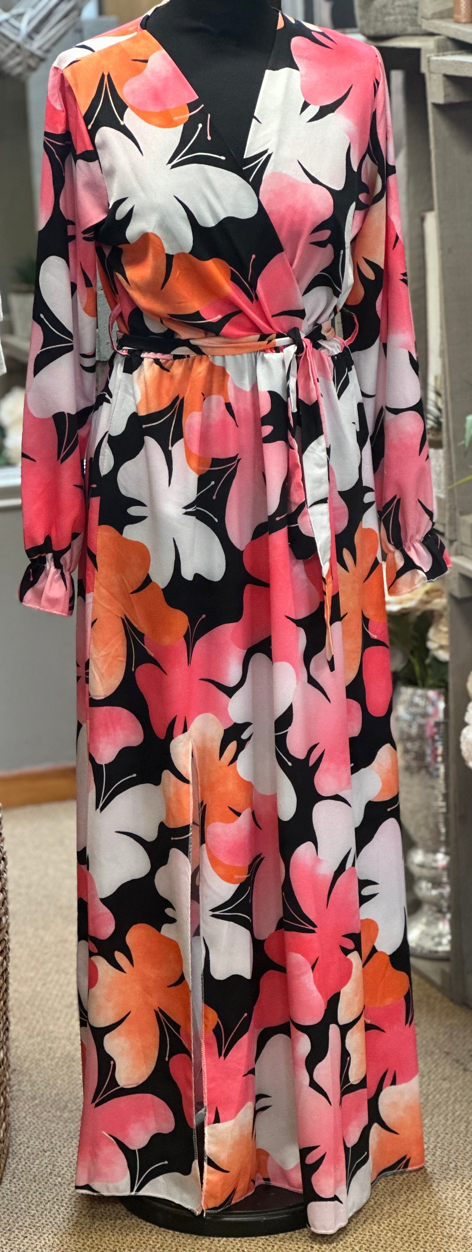 Step into a world of colour with this stunning floral wrap dress. Featuring a lively mix of pink, orange, black, and white hues, this dress is designed to make a statement. The wrap style cinches beautifully at the waist with a tie, creating a flattering silhouette, while the front slit adds a touch of allure. Perfect for any occasion, from garden parties to evening events, this dress combines comfort and high fashion effortlessly. Make a bold statement and turn heads with this must-have piece!