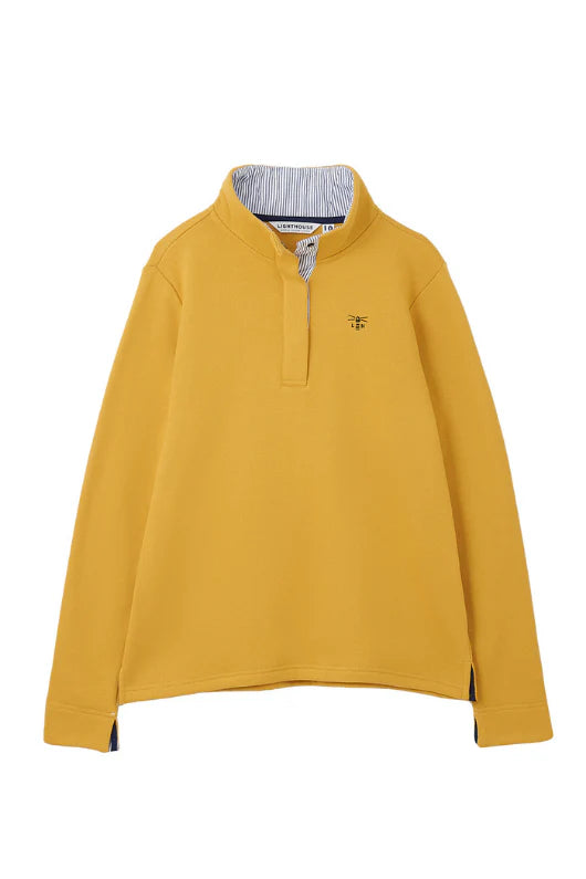 Stay cozy and chic with this mustard-colored, long-sleeved sweater. Featuring a classic collar with a button-up neck, this sweater adds a touch of sophistication to any outfit. The striped pattern on the collar provides a subtle, stylish detail. Perfect for layering or wearing on its own, this versatile sweater is a must-have for your wardrobe. Stay warm and fashionable with this timeless piece!