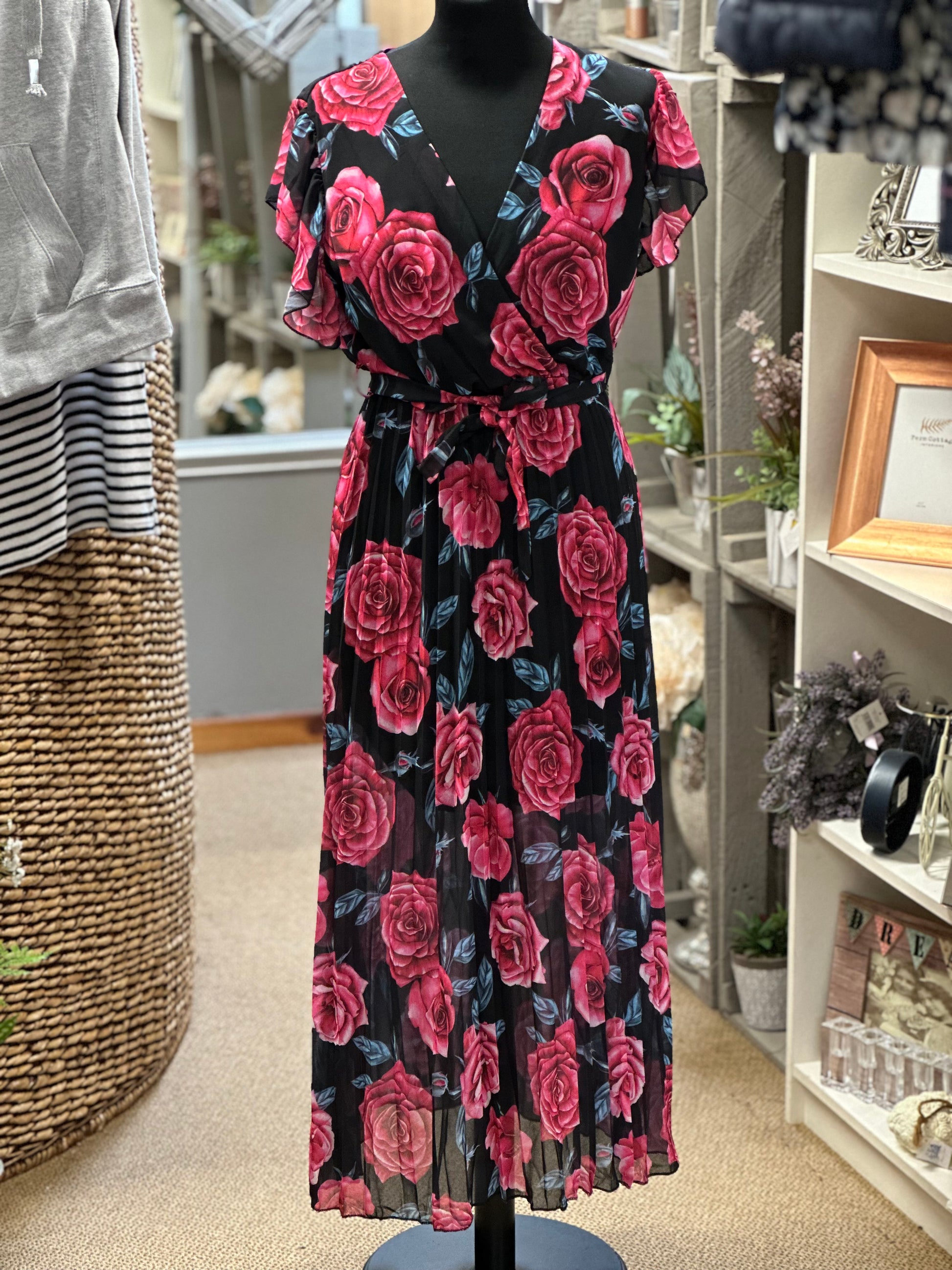 Step into sophistication with this stunning black dress, beautifully adorned with large pink roses and lush green leaves. The flattering V-neckline and delicate, short flutter sleeves add a touch of femininity, while the cinched waist with a tie enhances your silhouette. The pleated skirt flows gracefully, making it perfect for both daytime events and evening occasions. Whether you're attending a garden party or a special dinner, this dress is sure to turn heads. Add a touch of floral elegance to your wardrobe with this must-have piece!